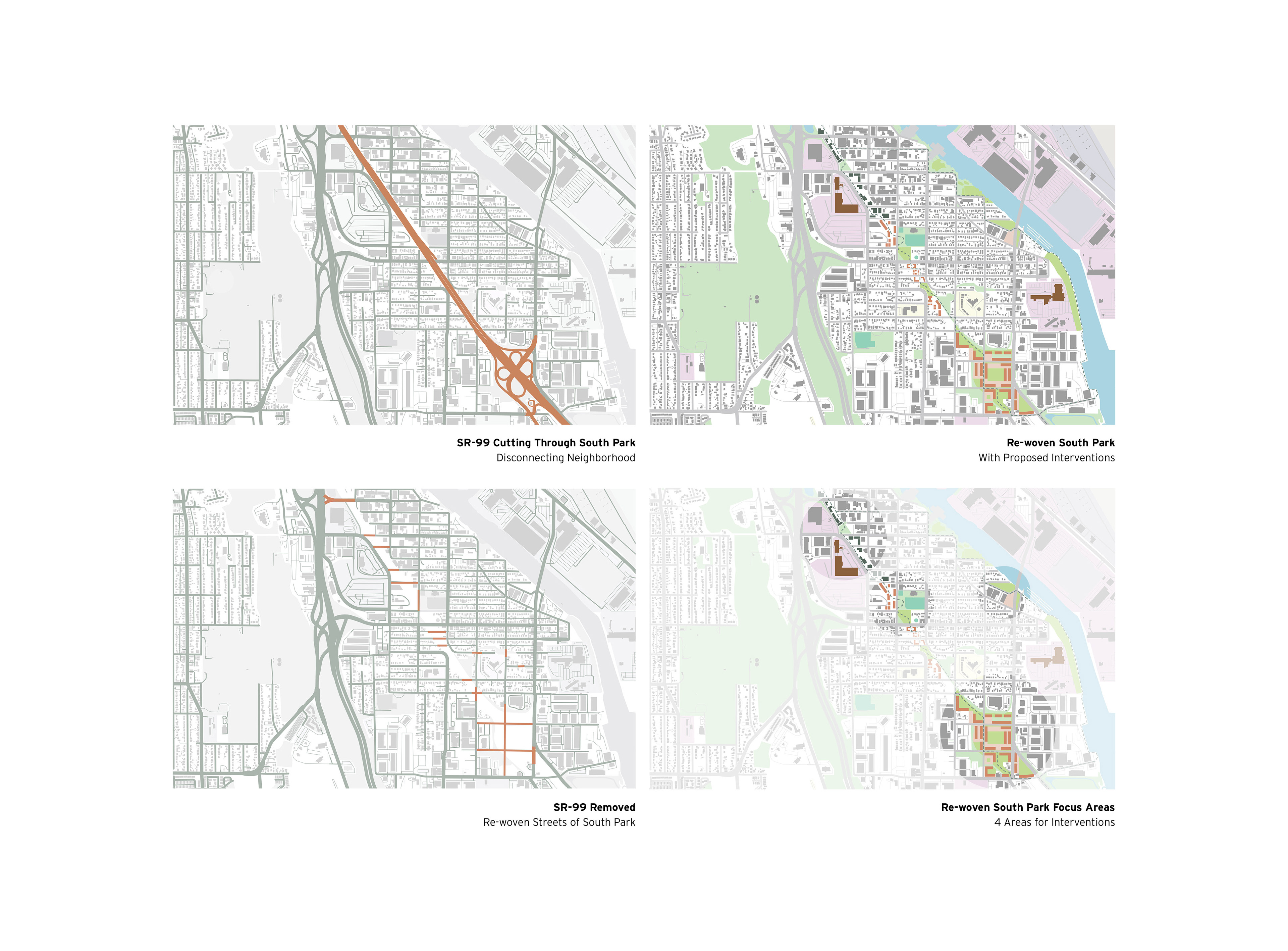 The project explores how the removal of SR-99 in South Park could be used as an opportunity to achieve community-identified goals in the neighborhood.